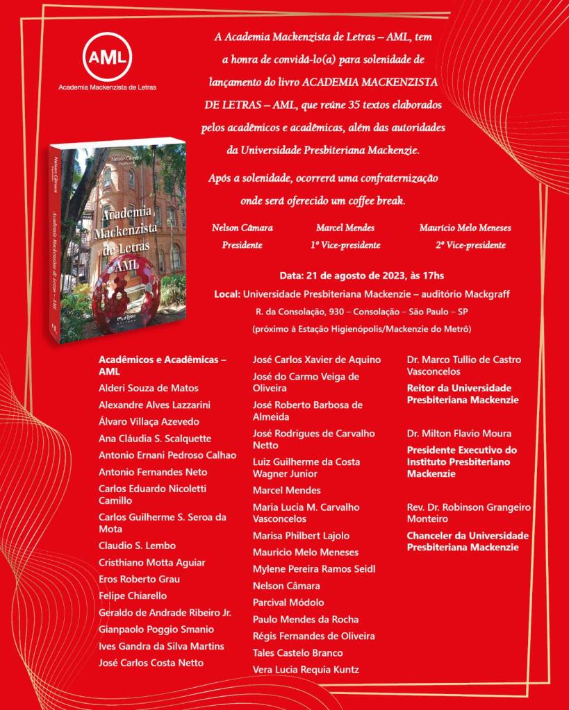 No próximo dia 21/08 (segunda-feira), no Auditório Mackgraphe, campus Higienópolis, a partir das 17h, a Academia Mackenzista de Letras – AML – lança livro que reúne 35 textos elaborados pelos acadêmicos e acadêmicas da instituição.