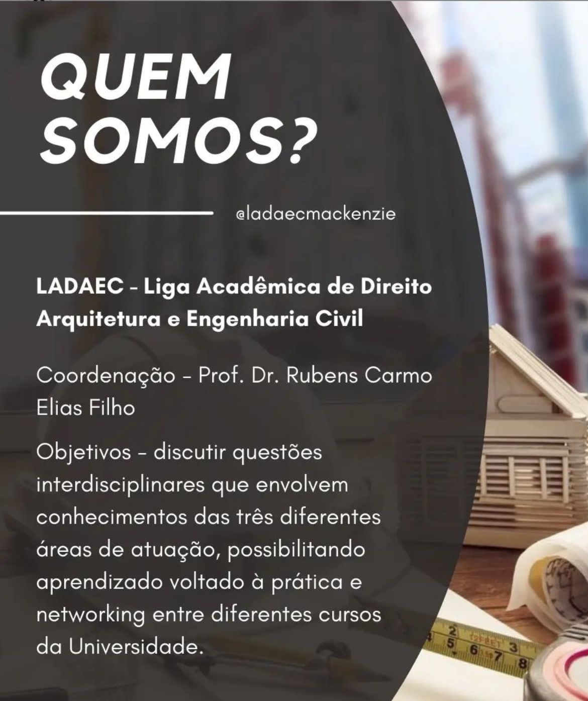 Durante a Semana Jurídica do 2º semestre da Universidade Presbiteriana Mackenzie, no campus Higienópolis, o Professor Dr. Rubens Carmo Elias Filho apresentará aos discentes as propostas e ideias do projeto. A chamada LADAEC procura reunir em discussões , debates e pesquisas as relações das três áreas da ciência: o Direito, a Arquitetura e a Engenharia Civil. A Liga conta com a maior participação por parte dos discentes e é coordenada pelo Professor, de modo que a reunião ocorrerá na Terça-Feira (22/08) das 7h30 às 9h00, na sala 107 do Prédio 45.
