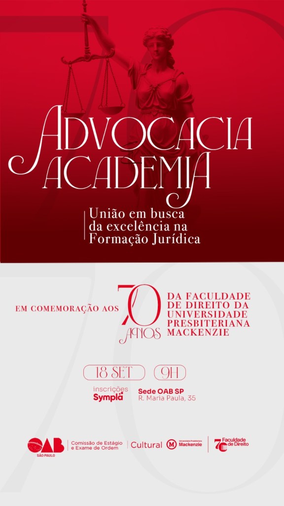 A OAB/SP, por meio da Comissão de Estágio e Exame de Ordem, realiza, na próxima segunda-feira (18/09), a partir das 9h, na sede da entidade (Rua Maria Paula, 35, no Centro), um evento de homenagem e comemoração aos 70 anos da Faculdade de Direito do Mackenzie.
