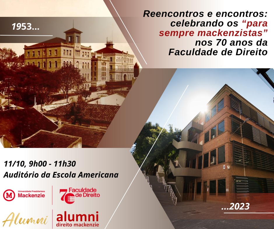 Em 2023, a Faculdade de Direito do Mackenzie completa 70 anos! Diversos eventos estão sendo realizados para marcar essa tão importante data e nada mais do que merecido termos um momento para (re)lembrar os antigos alunos do curso. Um espaço de encontros e reencontros de todos aqueles que ajudaram e ajudam a construir essa história, primeiro como alunos e agora como antigos alunos. Em uma parceria da Alumni Direito Mackenzie e a Faculdade de Direito, será realizado um evento de homenagem as turmas que estão completando 50 e 30 anos de formados, além de uma homenagem especial aos antigos alunos da primeira turma do curso e a todos os antigos alunos, de todas as gerações.