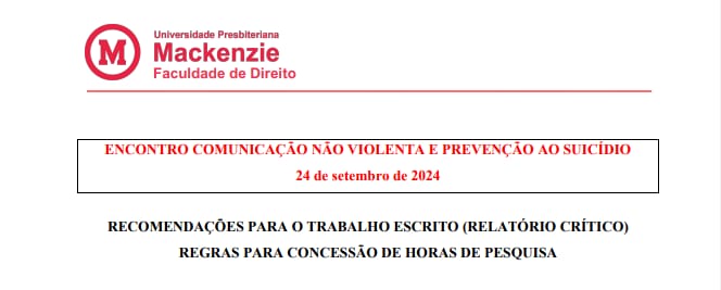 No dia 24 de setembro a Faculdade Presbiteriana Mackenzie, através do grupo de pesquisa CNPq “CriaDirMack: O direito à vez e a voz de crianças e adolescentes, realizará um encontro relacionado à comunicação não violenta e prevenção do suicídio em parceria com a Assembleia Legislativa de São Paulo. O evento acontecerá das 13:30 às 16:30 no Auditório Paulo Kobayashi, na Assembleia Legislativa do estado. Os discentes que comparecerem presencialmente ao evento, devidamente registrados em lista de presença poderão submeter relatório crítico, segundo uma das temáticas discutidas no encontro.