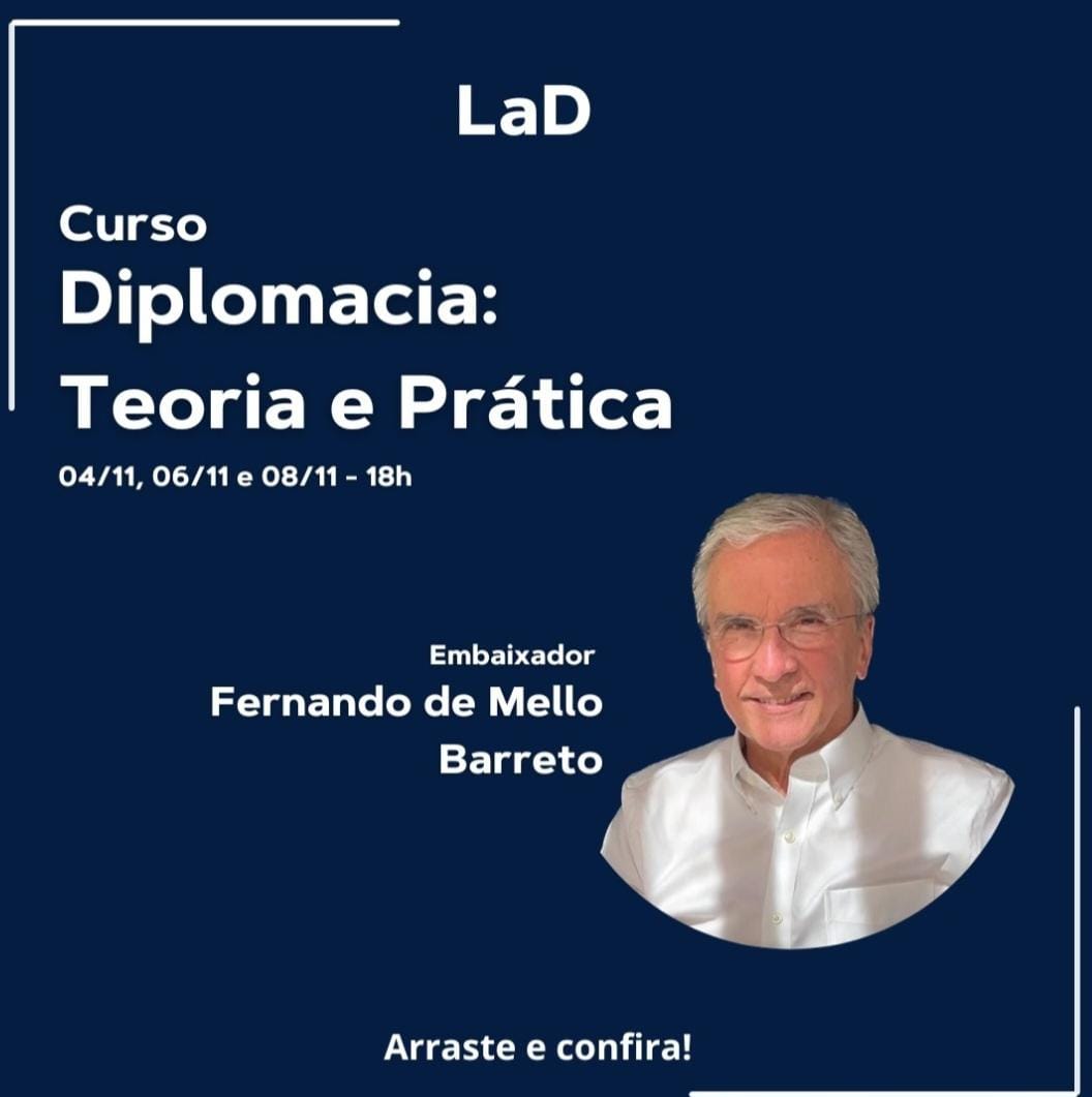 O Curso com o Embaixador Fernando de Mello Barreto, nos dias 04, 06 e 08 de Novembro de 2024, pretende dar um panorama sobre a carreira, as suas instituições e temas relevantes para a área, como política internacional e o desenvolvimento histórico da diplomacia, bem como, os desafios da prática diplomática e as perspectivas para a diplomacia do futuro. As aulas começarão às 18h e durarão em torno de 2 horas.