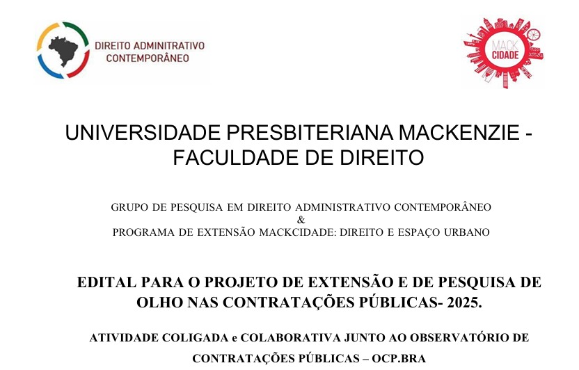 O grupo de pesquisa em Direito Administrativo Contemporâneo & Programa de extensão Mackcidade: Direito e espaço urbano abriu inscrições para o primeiro semestre de 2025. O grupo tem como objetivo com entender os regramentos e as