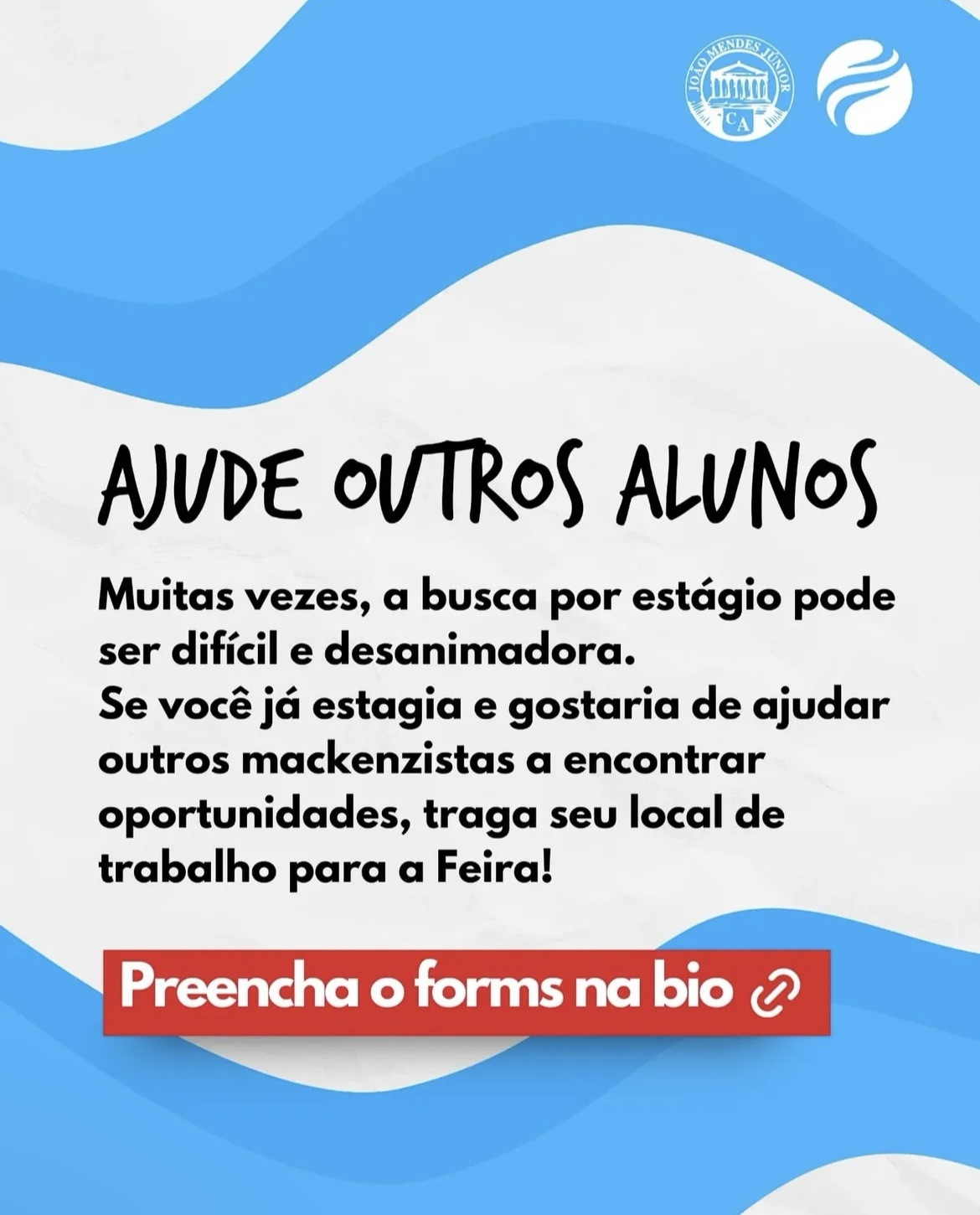 O CAJMJr está organizando a Feira de Estágios 2025, a qual contará com a participação de grandes escritórios e empresas. Além disso, sua sugestão de outros locais de trabalho para compor o evento é muito bem-vinda.