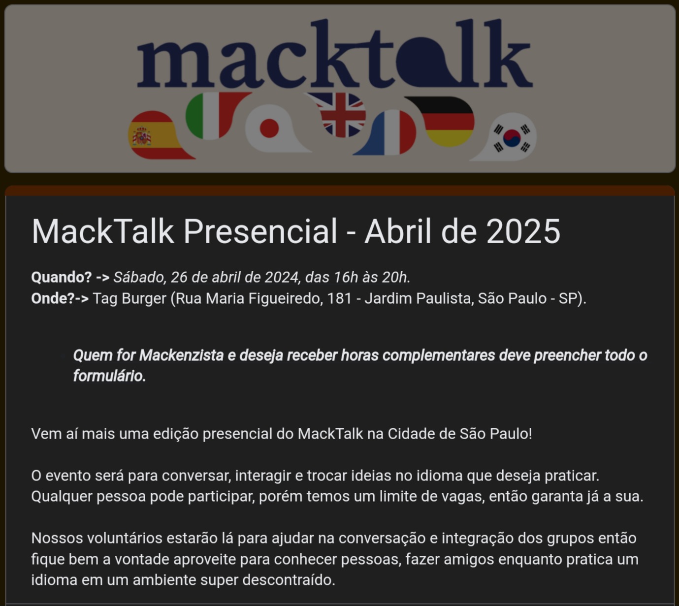 No dia 26/04, Sábado às 16 horas irá ocorrer mais uma vez o evento MackTalk, evento voltado para conversar e interagir no idioma que o participante desejar praticar! A participação é livre para quem quiser participar!