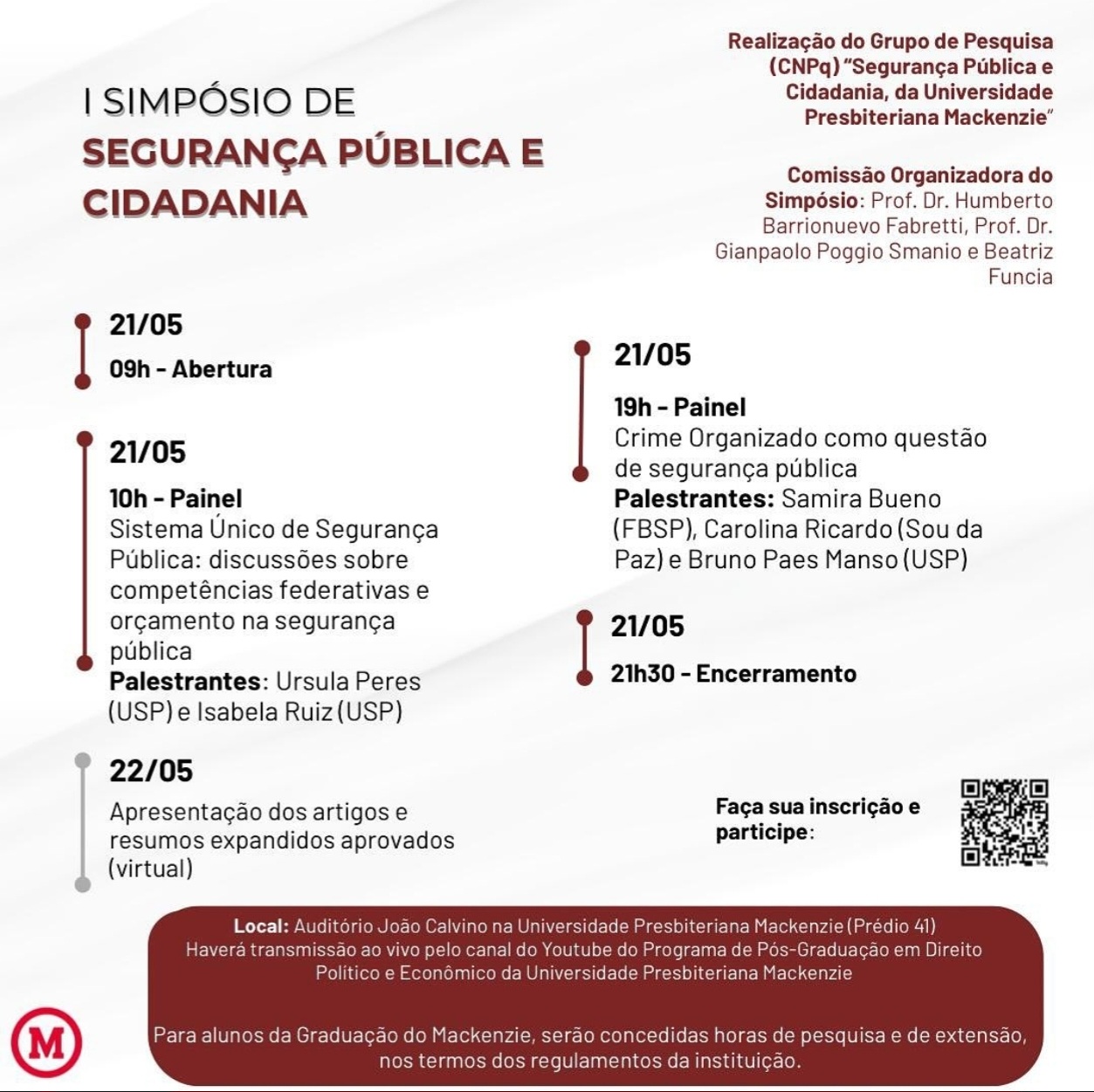 No dia 21/05, será realizado o Simpósio de Segurança Pública e Cidadania no Auditório João Calvino da Universidade Presbiteriana Mackenzie (UPM). O evento será transmitido ao vivo pelo canal do YouTube do Programa de Pós-Graduação em Direito Político e Econômico da UPM. Já as atividades ocorrerão em dois períodos: pela manhã, das 10h às 12h, e à noite, das 19h às 21h.