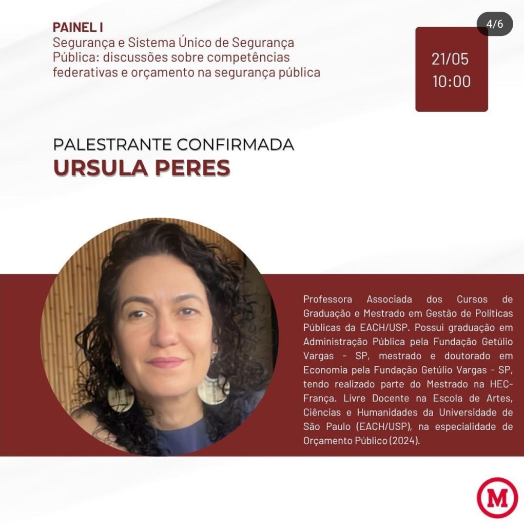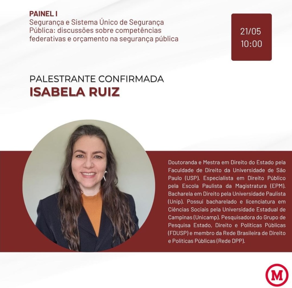 Às 10h ocorrerá o 1º Painel discutindo sobre: Sistema Único de Segurança Pública: discussões sobre competências federativas e orçamento na segurança Pública, dos Palestrantes: Ursula Peres (SUP) e Isabela Ruiz (USP)
