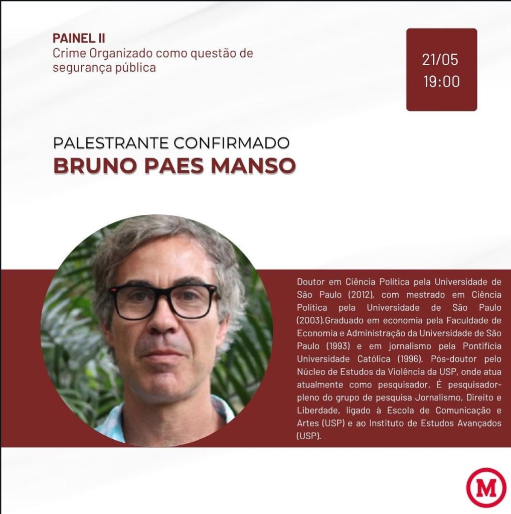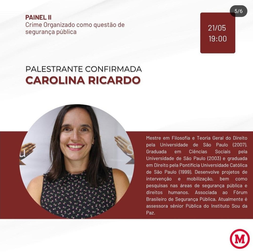 Além disso, às 19h ocorrerá o Painel sobre: “Crime Organizado como questão de segurança pública” Palestrantes: Samira Bueno (FBSP), Carolina Ricardo (Sou da Paz) e Bruno Paes Manso (USP)