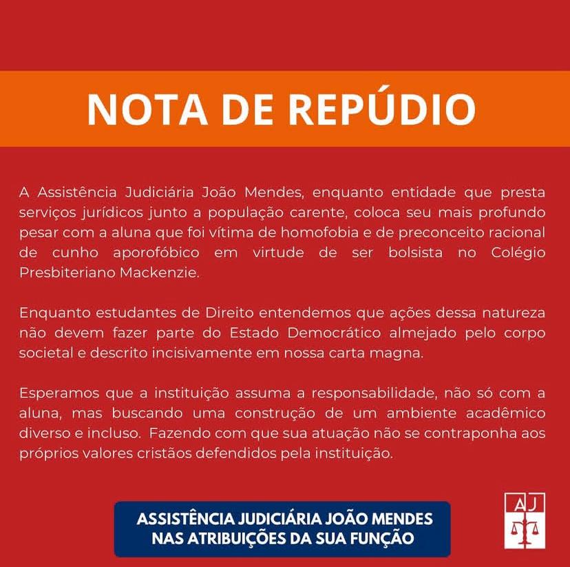 A Assistência Judiciária João Mendes publicou uma Nota de Repúdio a respeito do caso de homofobia e racismo que envolveu uma aluna do Colégio Mackenzie, nas últimas semanas.