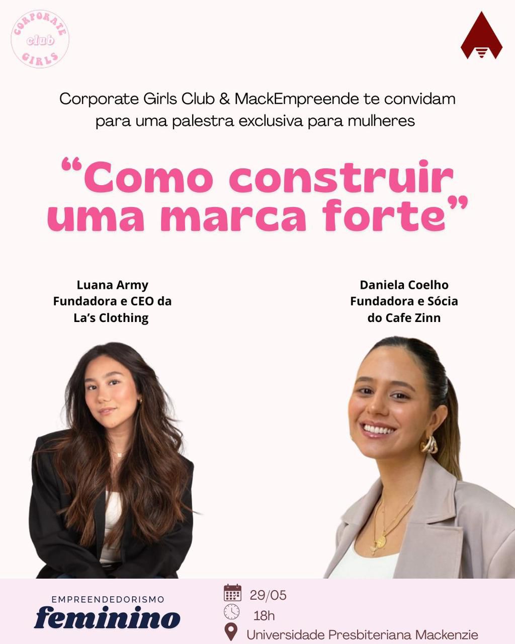 O MackEmpreende, em parceria com o Corporate Girls Club, preparou uma palestra imperdível com o tema: “Como construir uma marca forte” .💡