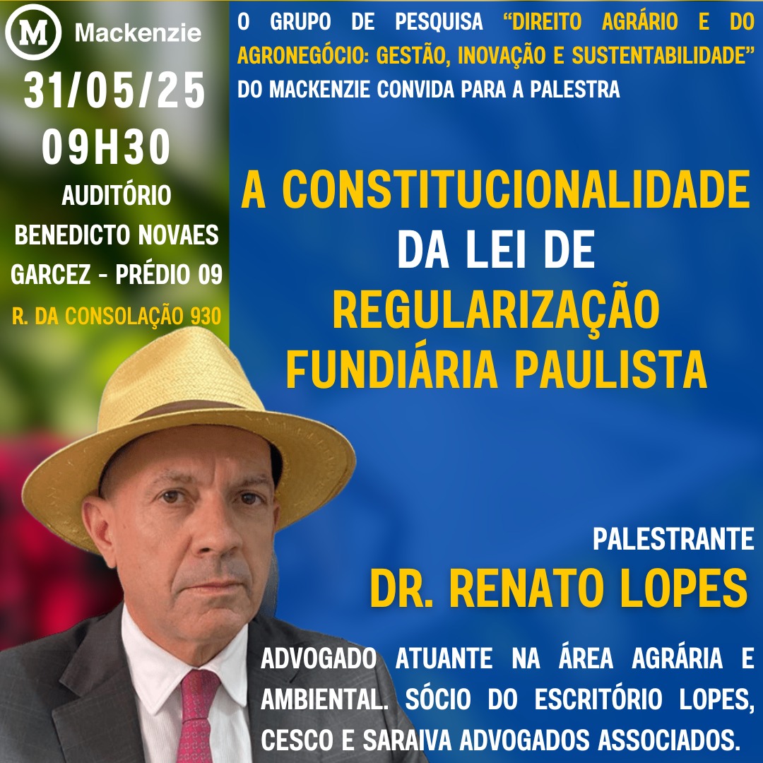 No dia 31/05/2025, sábado, o grupo de pesquisa do Agronegócio do professor Washington, irá apresentar a palestra “A Constitucionalidade da Lei de Regularização Fundiária Paulista”, que será apresentada pelo Dr. Renato Lopes.