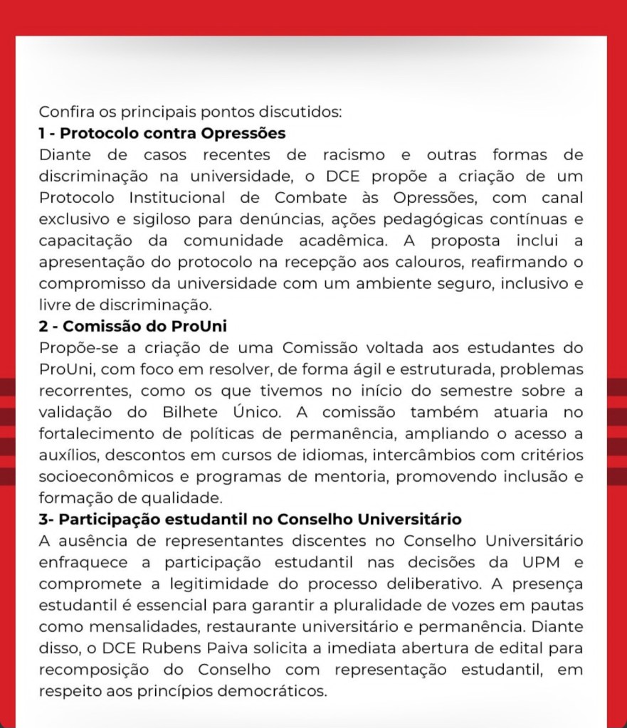 No dia 23/05, o Diretório Central dos Estudantes Rubens Paiva se reuniu com a Reitoria, a outros Diretórios e Centros Acadêmicos, com objetivo de apresentar pautas urgentes da comunidade estudantil.