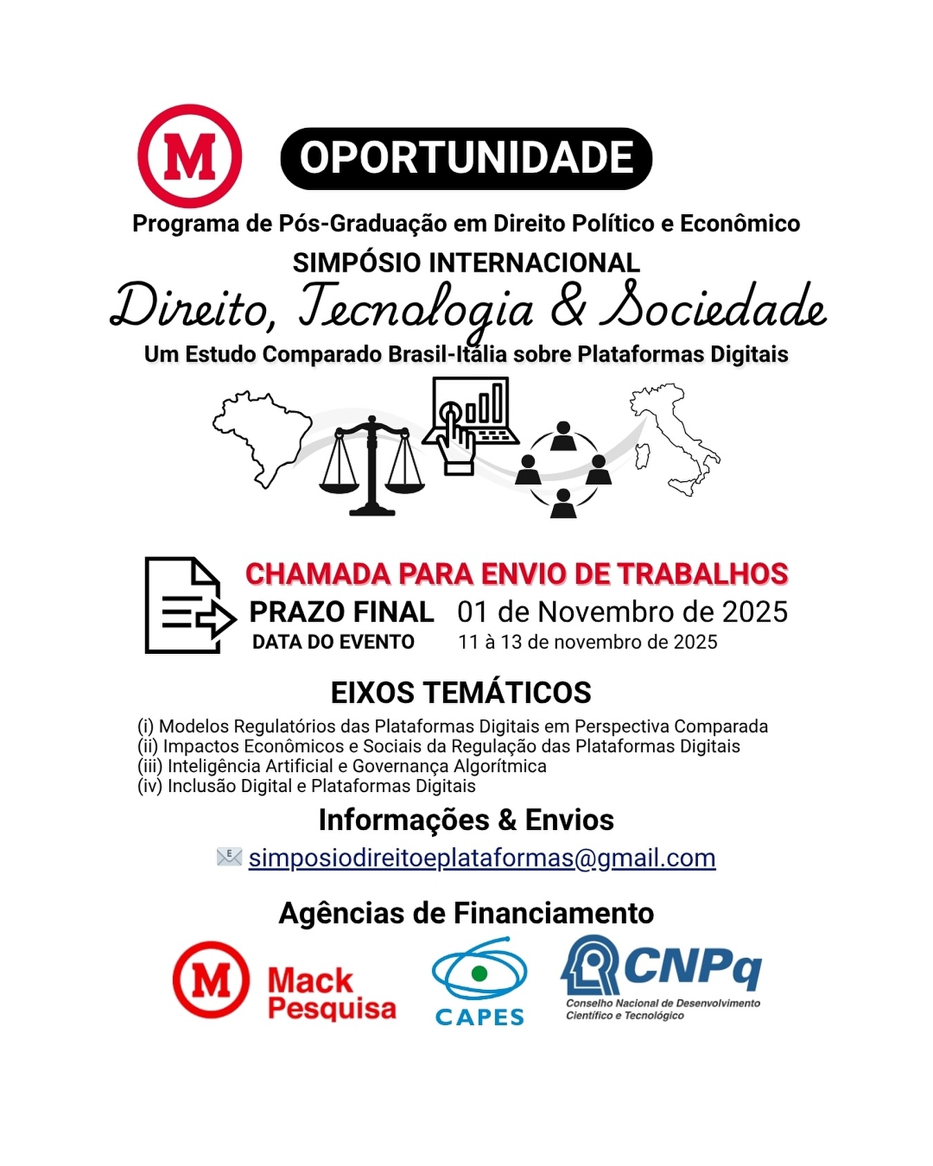 O Programa de Pós-Graduação em Direito Político, em parceria com o Consulado Geral da Itália e com apoio das agências de financiamento CAPES, CNPq e MackPesquisa, anuncia o evento “Simpósio Internacional: Direito, Tecnologia e Sociedade: Um Estudo Comparado Brasil-Itália sobre Plataformas Digitais”, realizado no âmbito do projeto de pesquisa “Tribunais, Cidadania e Acesso às Atividades Econômicas na Sociedade Digital: Um exame sociojurídico das demandas econômicas das plataformas em juízo”.
