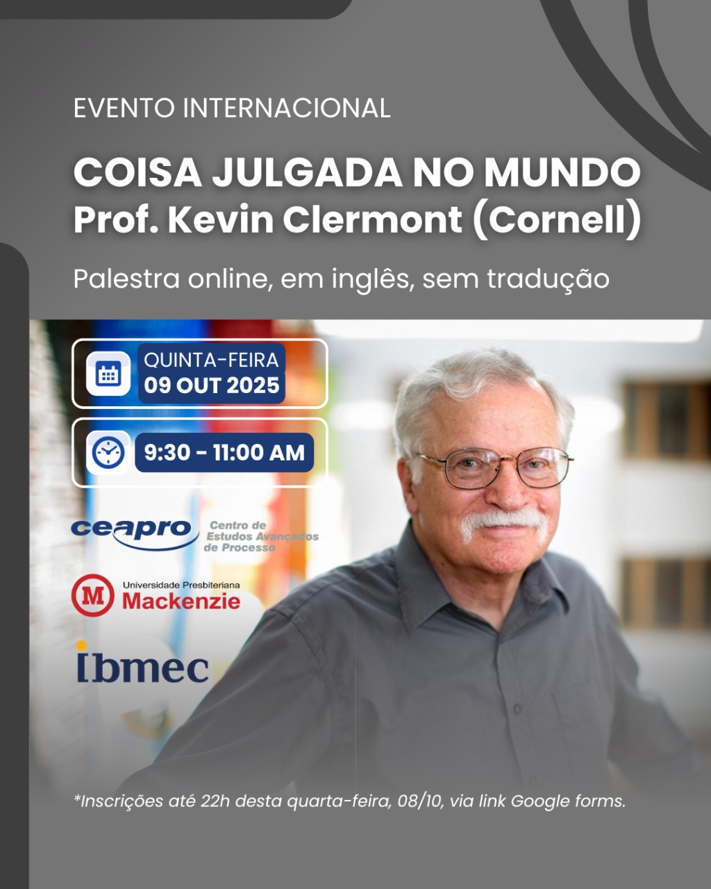Amanhã, dia 09/10/2025 às 09:30 acontecerá a palestra online em inglês exclusiva para associados do Ceapro, alunos do IBMEC e alunos do Mackenzie sobre “Coisa Julgada no Mundo” pelo Professor Kevin Clermont da Universidade de Cornell.
