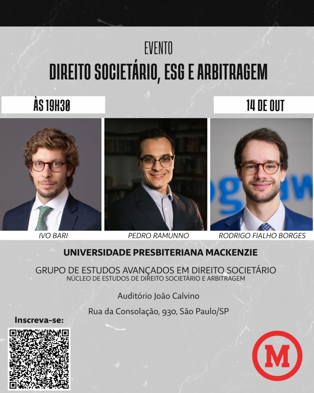 O Grupo de Estudos Avançados em Direito Societário da Universidade Presbiteriana Mackenzie promove, no dia 14 de outubro, às 19h30, o evento “Direito Societário, ESG e Arbitragem”, com a participação dos professores Ivo Bari, Pedro Ramunno e Rodrigo Fialho Borges.