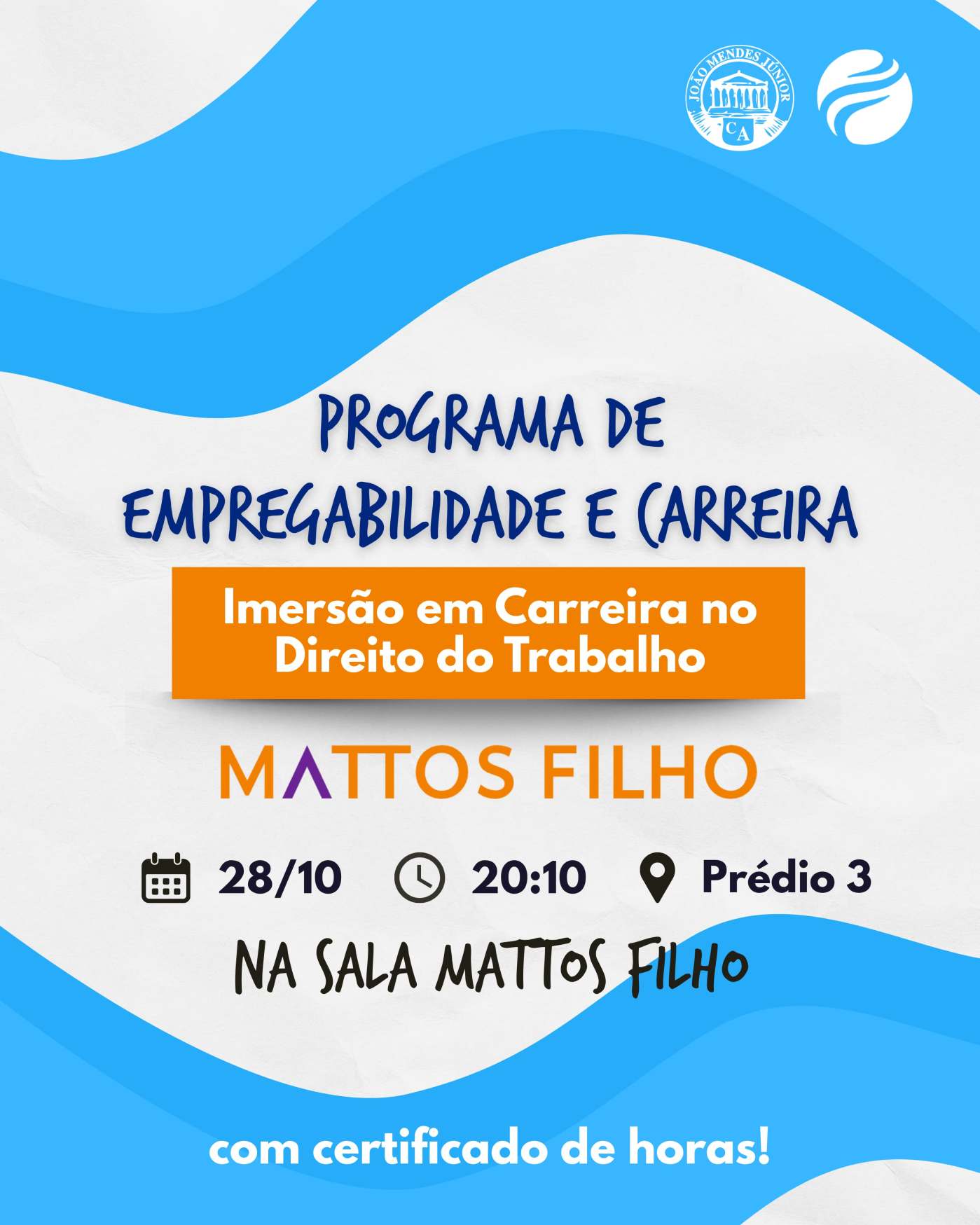 O Centro Acadêmico João Mendes Júnior (CAJMJr.) promove, em parceria com o escritório Mattos Filho, uma imersão jurídica exclusiva em Direito do Trabalho para estudantes da Faculdade de Direito da Universidade Presbiteriana Mackenzie.