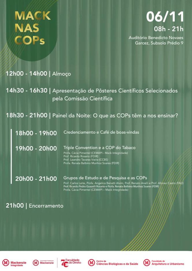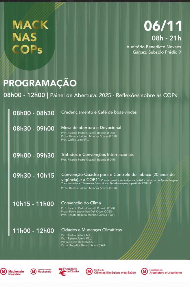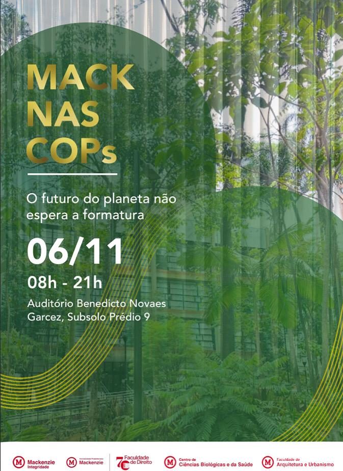 No dia 06 de novembro de 2025 irá acontecer o evento MACK nas COPs no Auditório Benedicto Novael Garcez, Subsolo do Prédio 9 com reflexões sobre as COPs.