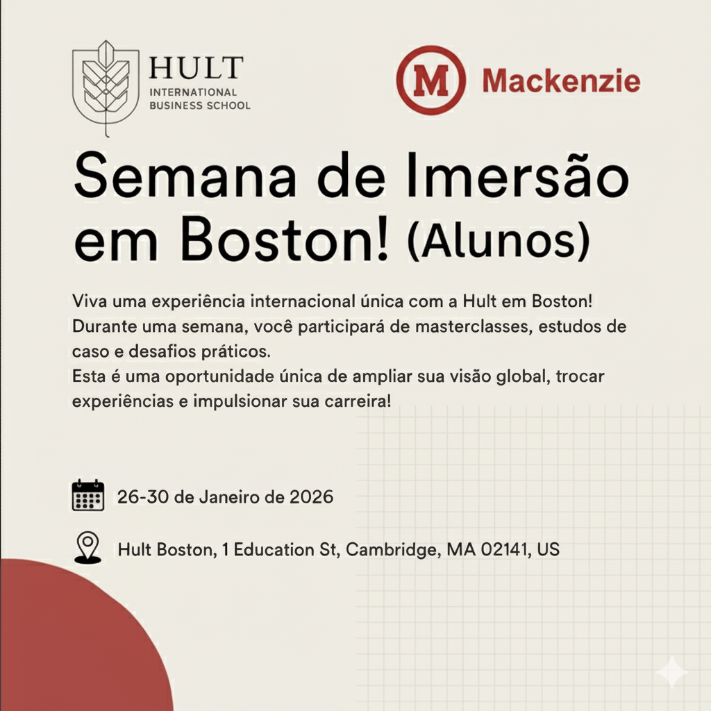 A imersão ocorrerá de 26 a 30 de janeiro de 2026, no campus da Hult International Business School, em Boston (EUA). O programa oferece 20 bolsas parciais, sendo 15 vagas para alunos da graduação e 5 para pós-graduação.