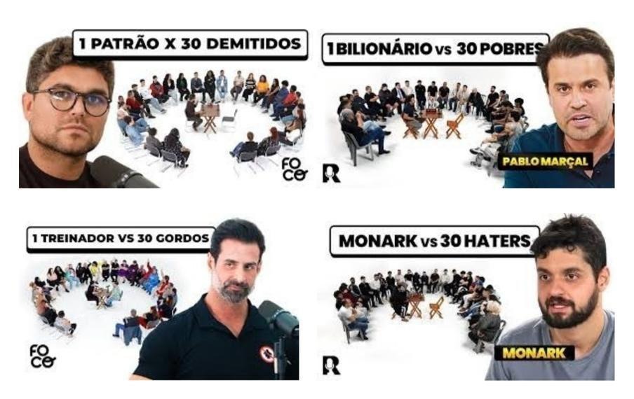Nos últimos tempos, tem-se observado a ascensão de uma série de vídeos virais na internet que colocam um único indivíduo em confronto com um grupo de pessoas, variando entre 20 e 30 participantes. Esses debates abordam assuntos diversos, como empregos, riqueza, saúde, religião, ou até mesmo celebridades que têm a oportunidade de debater com seus haters. Entre os mais virais estão: “1 Patrão vs 30 Demitidos” (empresário Tallis Gomes), “1 Bilionário vs 30 Pobres” (Pablo Marçal), “1 Cristão vs 30 Ateus” (Pastor Daniel Gontijo), “1 Treinador vs 30 Gordos” (Guto Galamba), “Monark vs 30 Haters” (Bruno Monteiro ‘Monark’) entre tantos outros.