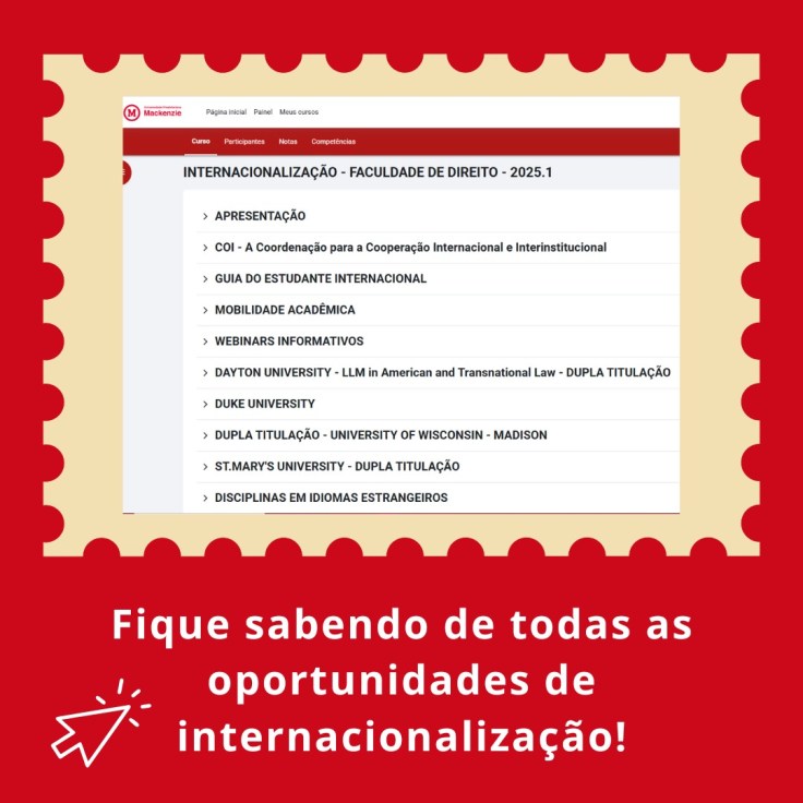 Todas as informações detalhadas sobre o processo de internacionalização, critérios de elegibilidade, universidades parceiras e orientações gerais estão disponíveis no Moodle, através do link: https://www.mackenzie.br/editais-abertos