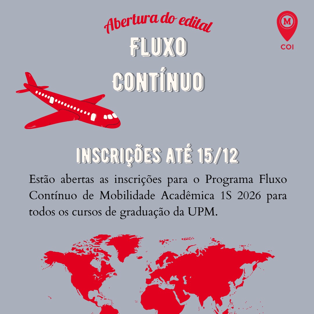 O Programa Fluxo Contínuo de Mobilidade Acadêmica da Universidade Presbiteriana Mackenzie (UPM), promovido pela Coordenação de Cooperação Internacional e Interinstitucional (COI), está com inscrições abertas até 15 de dezembro de 2025.