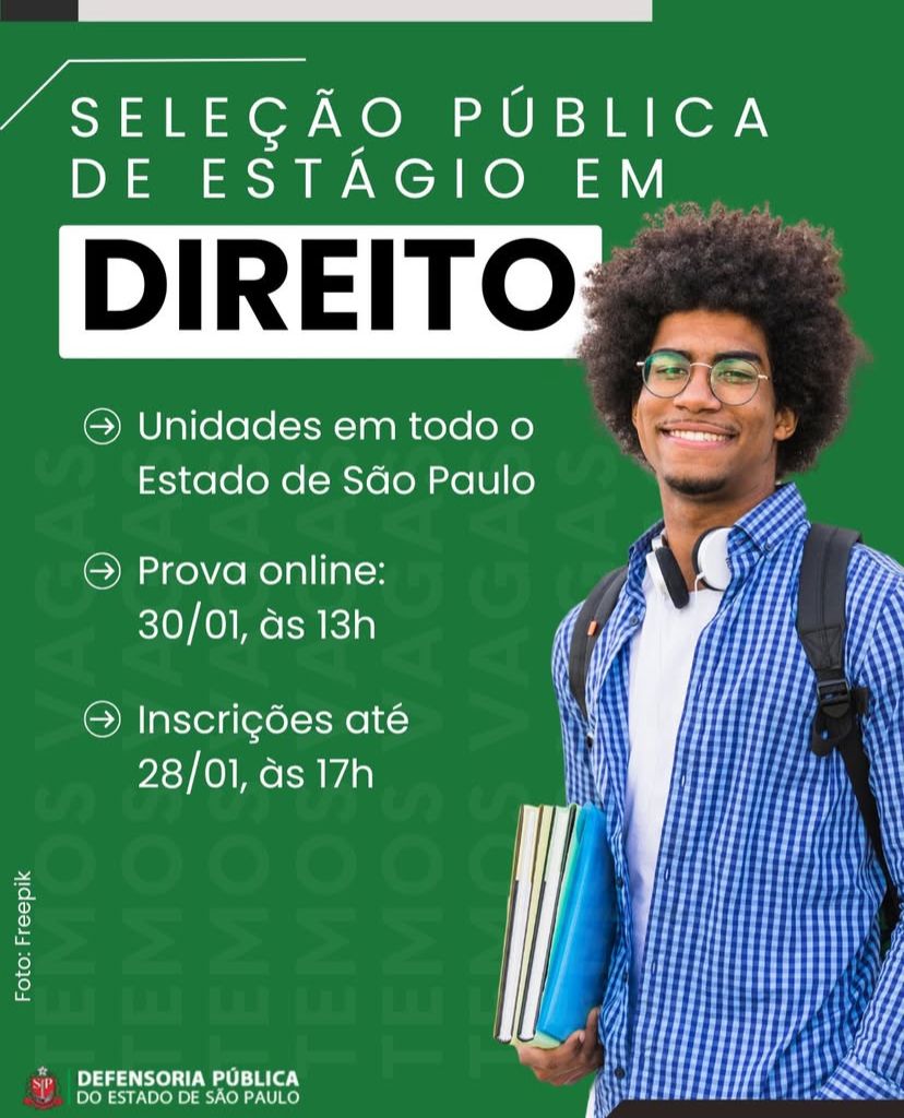 A Defensoria Pública do Estado de São Paulo está com inscrições abertas para a Seleção Pública Continuada de Estágio em Direito – Janeiro/2026, destinada a estudantes de graduação interessados em atuar em unidades da instituição em todo o Estado.