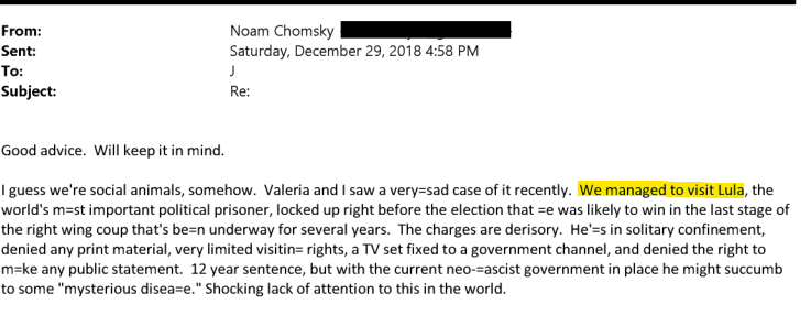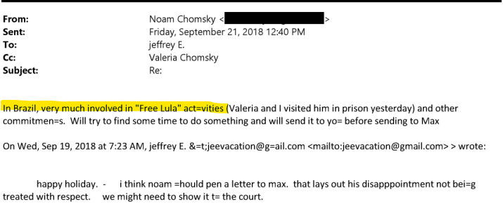 Noam Chomsky para Epstein: “No Brasil, muito envolvido nas atividades do movimento Lula Livre…”. Daí ficam as seguintes perguntas, como assim envolvido? O quão envolvido? Tem dinheiro? Quanto? Porque lhes interessam a política brasileira?