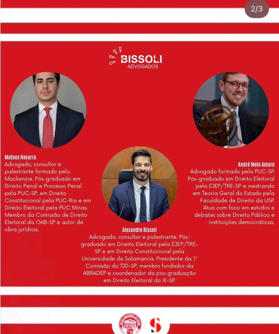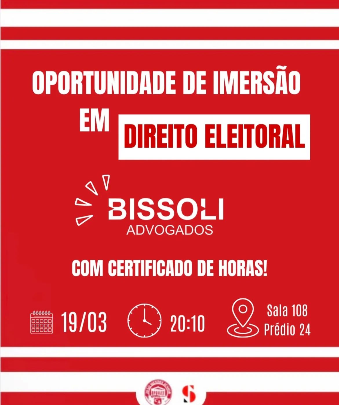 O Centro Acadêmico do Mackenzie, em parceria com o escritório Bissoli Advogados, promoverá uma imersão em Direito Eleitoral voltada exclusivamente para alunos da universidade. O encontro acontecerá no dia 19 de março, às 20h10, na sala 108 do prédio 24, e contará com a participação dos advogados Alexandre Bissoli, Mateus Navarro e André Melo Amaro, especialistas na área.