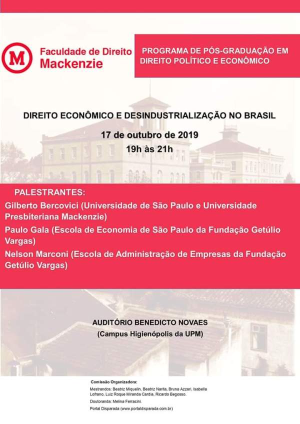 Palestra sobre Direito Econômico e Desindustrialização no Brasil será realizada no dia 17/10