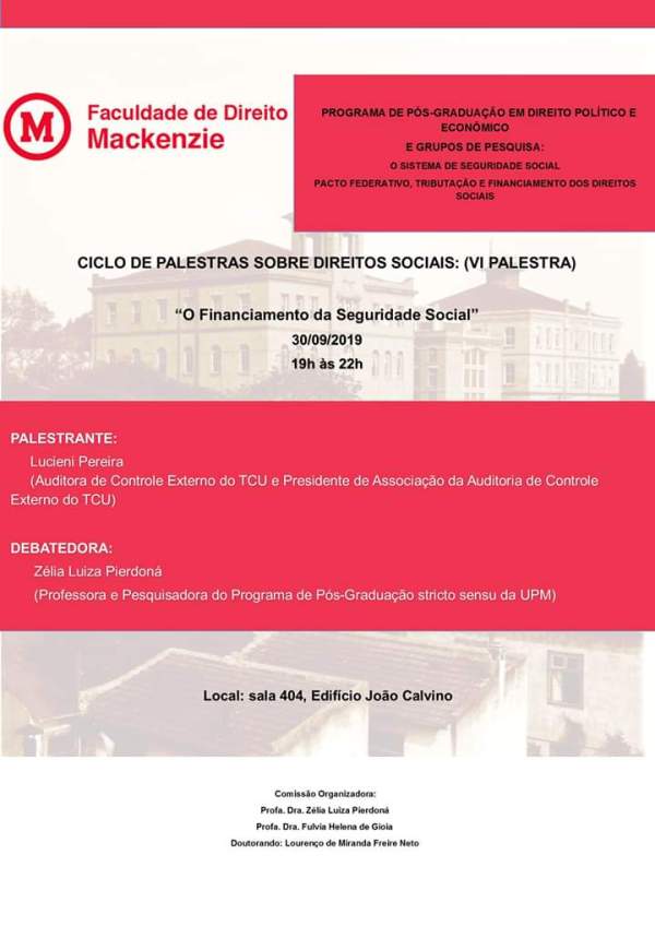 A palestra abordará o tema "O Financiamento da Seguridade Social" e será realizada no dia 30 de setembro de 2019 na sala 404 do Edifício João Calvino das 19 horas às 22 horas. A comissão organizadora é formada pela Profa. Dra. Zélia Luiza Pierdoná, Profa. Dra. Fulvia Helena de Gioia e pelo Doutorando Lourenço de... Continuar Lendo →