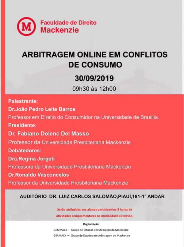 A palestra "Arbitragem Online em Conflitos de Consumo", organizada pelo Grupo de Estudos de Mediação (GemmMack), acontecerá no Auditório Dr. Luís Carlos Salomão, na Rua Piauí, 181 - 1º andar, no dia 30/09/19 das 09h30 às 12h00. Com o palestrante Dr. João Pedro Leite Barros, professor de Direito do Consumidor da Universidade de Brasília, o evento... Continuar Lendo →