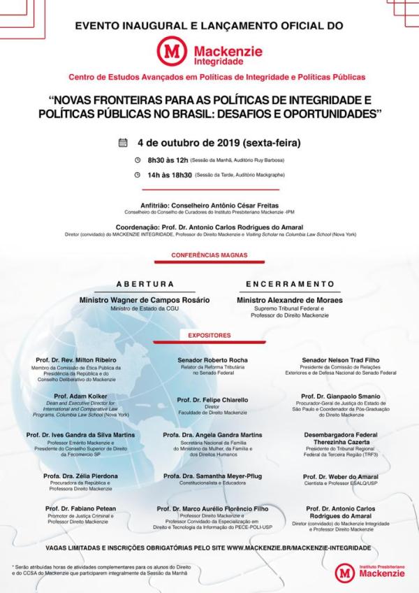 Para inaugurar o "Centro de Estudos Avançados em Políticas de Integridade e Políticas Públicas", o Mackenzie Integridade promove evento que abordará o tema: "Novas fronteiras para as políticas de integridade e políticas públicas no Brasil: desafios e oportunidades", que contará com conferências magnas com participação do Ministro de Estado da Controladoria-Geral da União (CGU) e... Continuar Lendo →