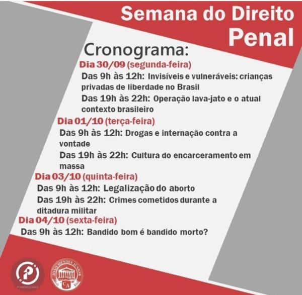 Nosso Centro Acadêmico João Mendes Júnior organizou a 'Semana do Direito Penal'. Serão 4 dias de palestras, sem exigência de inscrição prévia (ordem de chegada), sistema PAI (abono de faltas), atribuição de horas de extensão a cada tema e também de horas de pesquisa mediante entrega posterior de relatório crítico via Moodle (inclusive nos termos... Continuar Lendo →