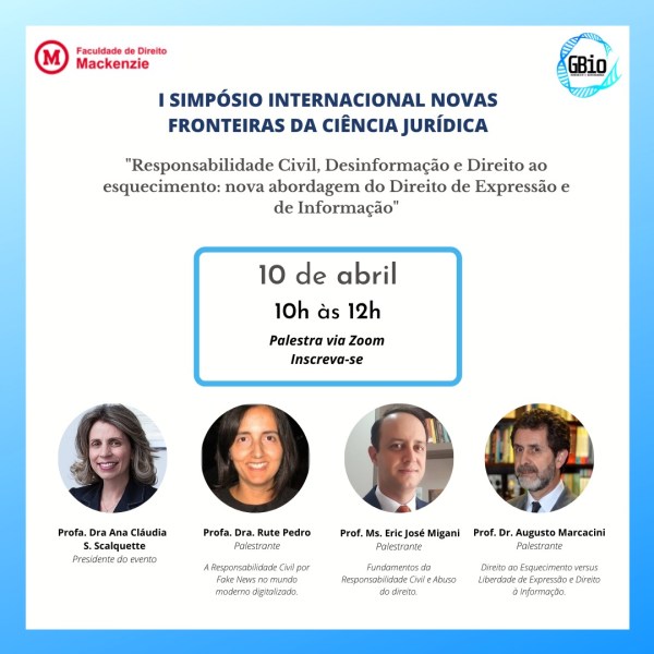 "Responsabilidade Civil, Desinformação e Direito ao esquecimento: nova abordagem do Direito de Expressão e de Informação" O formulário de inscrição está finalmente aberto! A palestra ocorrerá no dia 10/04/2021 das 10h às 12h e vai ceder 3 horas de extensão para quem estiver presente. Essa terá a Profa. Dra. Ana Cláudia S. Scalquette como presidente... Continuar Lendo →