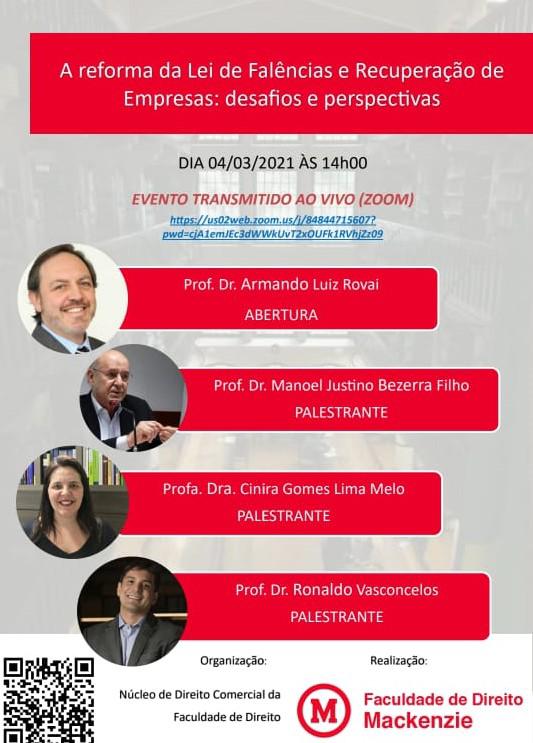 Nesta quinta-feira, 04.03.2021, às 14h, o Núcleo de Direito Comercial da Faculdade de Direito da Universidade Presbiteriana Mackenzie promoverá o evento: "Reforma da Lei de Falências e Recuperação de Empresas: desafios e perspectivas". O evento ocorrerá pela plataforma ZOOM, acessando o link abaixo: https://us02web.zoom.us/j/84844715607?pwd=cjA1emJEc3dWWkUvT2xOUFk1RVhjZz09. Os alunos da Faculdade de Direito do Mackenzie que estiverem presentes... Continuar Lendo →