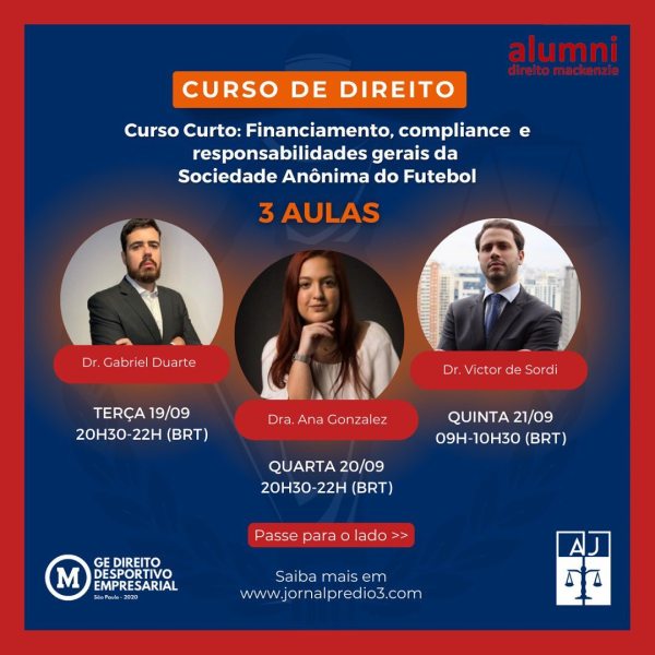 A Assistência Judiciária João Mendes (AJ), órgão de orientação jurídica gratuita à população de baixa renda, dos alunos e antigos alunos da Faculdade de Direito do Mackenzie, anuncia, a realização do curso "Regulamentação do Futebol no Brasil: Legislação, financiamento e estrutura”, composto por três aulas que integram o seu conteúdo, sendo elas: Aula 1 – Evolução Legislativa... Continuar Lendo →