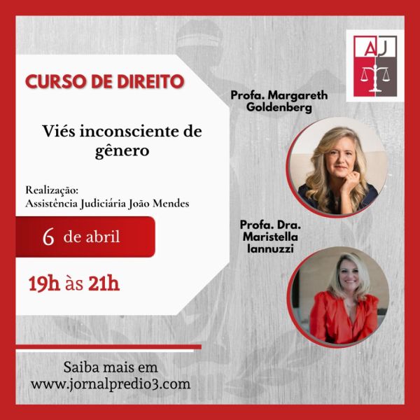 A Assistência Judiciária João Mendes (AJ), órgão de orientação jurídica gratuita à população de baixa renda, dos alunos e antigos alunos da Faculdade de Direito do Mackenzie, anuncia a realização do Curso “Viés Inconsciente de Gênero ”, que será ministrado pela Profa. Margareth Goldenberg, que é psicóloga e psicopedagoga, especialista em direitos humanos & mundo... Continuar Lendo →