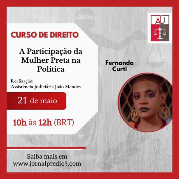 A Assistência Judiciária João Mendes (AJ), órgão de orientação jurídica gratuita à população de baixa renda, dos alunos e antigos alunos da Faculdade de Direito do Mackenzie, anuncia a realização do Curso “A Participação da Mulher Preta na Política ”, que será ministrado pela pré-candidata à Deputada Federal, Fernanda Curti. Será abordado no curso:- Desafio... Continuar Lendo →