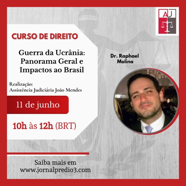 A Assistência Judiciária João Mendes (AJ), órgão de orientação jurídica gratuita à população de baixa renda, dos alunos e antigos alunos da Faculdade de Direito do Mackenzie, anuncia a realização do Curso “Guerra da Ucrânia: Panorama Geral e Impactos ao Brasil ”, que será ministrado pelo Dr. Raphael Molina, Sócio de Molina & Reis Sociedade... Continuar Lendo →
