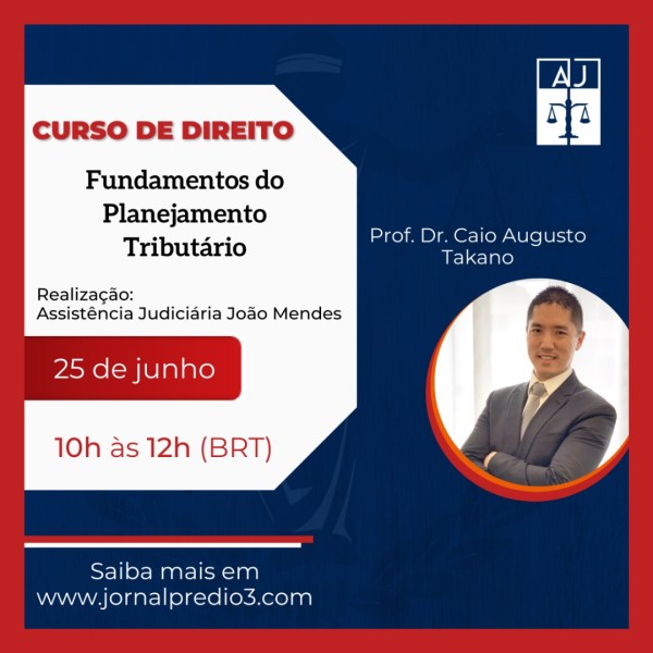 A Assistência Judiciária João Mendes (AJ), órgão de orientação jurídica gratuita à população de baixa renda, dos alunos e antigos alunos da Faculdade de Direito do Mackenzie, anuncia a realização do Curso “Fundamentos do Planejamento Tributário”, que será ministrado pelo Prof. Dr. Caio Augusto Takano, Doutor e Mestre em Direito Econômico, Financeiro e Tributário pela... Continuar Lendo →