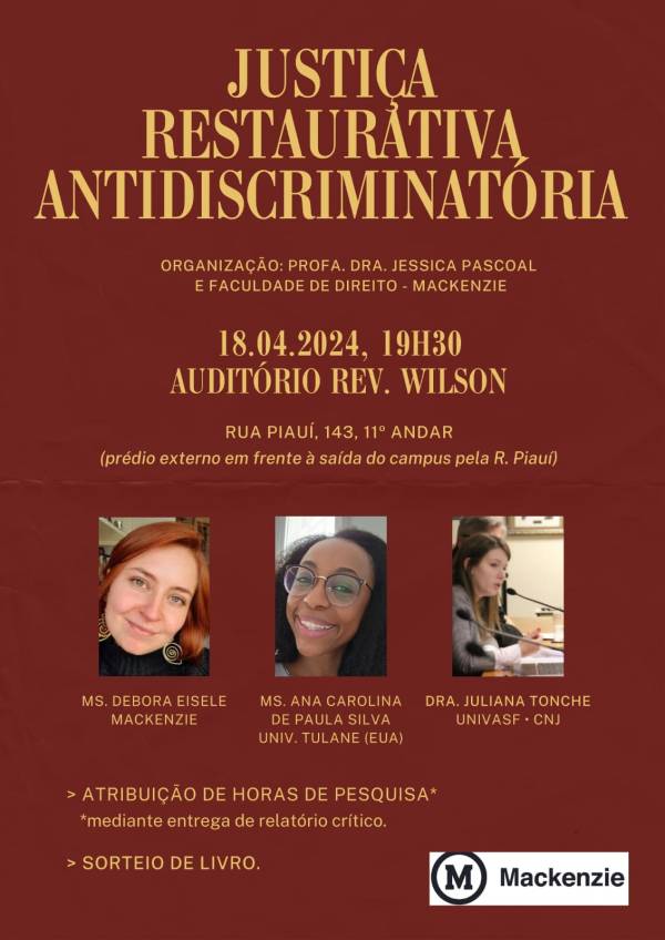 Já ouviram falar em “Justiça Restaurativa Antidiscriminatória”? Organizado pela Prof. Dra. Jessica Pascoal e coordenado pela Prof. Dra. Michelle Asato Junqueira, o evento a respeito desse tema ocorrerá no auditório Reverendo Wilson, no dia 18 de abril de 2024, das 19h30 às 21h30, em formato presencial. Os discentes que comparecerem ao evento presencialmente, bem como... Continuar Lendo →