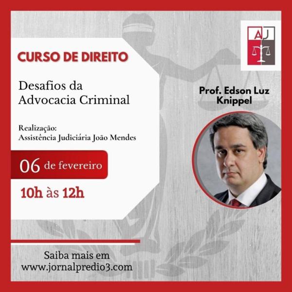 A Assistência Judiciária João Mendes (AJ), órgão de orientação jurídica gratuita à população de baixa renda, dos alunos e antigos alunos da Faculdade de Direito do Mackenzie, anuncia a realização do Curso “Desafios da Advocacia Criminal”, que será ministrado pelo professore da Faculdade de Direito do Mackenzie, Edson Knippel. Data: 06/02/2021 (Sábado) Horário: 10h ao... Continuar Lendo →