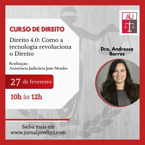 A Assistência Judiciária João Mendes (AJ), órgão de orientação jurídica gratuita à população de baixa renda, dos alunos e antigos alunos da Faculdade de Direito do Mackenzie, anuncia a realização do Curso “Direito 4.0: Como a tecnologia revoluciona o direito ”, que será ministrado pela advogada Dra. Andressa Barros. Data: 27/02/2021 (Sábado). Horário: 10hs às... Continuar Lendo →