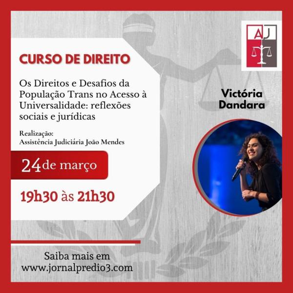 A Assistência Judiciária João Mendes (AJ), órgão de orientação jurídica gratuita à população de baixa renda, dos alunos e antigos alunos da Faculdade de Direito do Mackenzie, anuncia a realização do Curso “Os Direitos e Desafios da População Trans no Acesso à Universidade: Reflexões Sociais e Jurídicas ”, que será ministrado por Victória Dandara. Data:... Continuar Lendo →