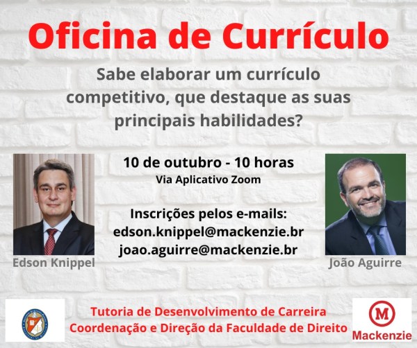 Sabe elaborar um currículo competitivo, que destaque as suas principais habilidades? No dia 10 de outubro (sábado) às 10h, haverá a primeira Oficina de Currículo 2020, elaborada pela Tutoria de Desenvolvimento de Carreira e a Coordenação e Direção da Faculdade de Direito. Contando com a presença ilustre dos professores Edson Knippel e João Aguirre, via... Continuar Lendo →