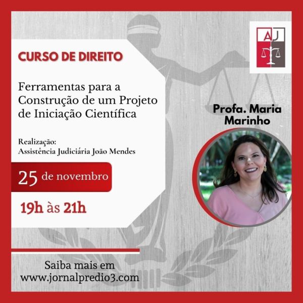 A Assistência Judiciária João Mendes (AJ), órgão de orientação jurídica gratuita à população de baixa renda, dos alunos e antigos alunos da Faculdade de Direito do Mackenzie, anuncia a realização do Curso “Ferramentas para a Construção de um Projeto de Iniciação Científica”, que será ministrado pela professora Maria Marinho, de Metodologia Jurídica, que é doutora... Continuar Lendo →