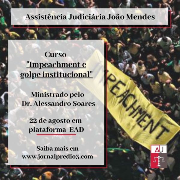 A Assistência Judiciária João Mendes (AJ), órgão de orientação jurídica gratuita à população de baixa renda, dos alunos e antigos alunos da Faculdade de Direito do Mackenzie, anuncia a realização do Curso “Impeachment e golpe institucional”, que será ministrado pelo Dr. Alessandro Soares, professor de Direito Constitucional Faculdade de Direito do Mackenzie, Doutor no programa... Continuar Lendo →