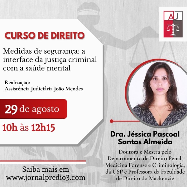 A Assistência Judiciária João Mendes (AJ), órgão de orientação jurídica gratuita à população de baixa renda, dos alunos e antigos alunos da Faculdade de Direito do Mackenzie, anuncia a realização do Curso “Medidas de segurança: a interface da justiça criminal com a saúde mental”, que será ministrado pelo Dra. Jéssica Pascoal Santos Almeida, doutora e... Continuar Lendo →