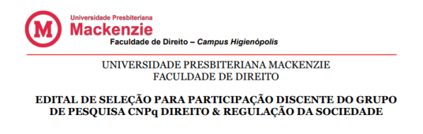 Edital de seleção – Grupo de Pesquisa CNPq de Direito & Regulação da Sociedade.