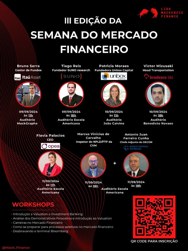 Prepare-se para a III Edição da Semana do Mercado Financeiro! A Liga Mackenzie Finance tem o prazer de convidar todos os alunos mackenzistas para a tão esperada III Edição da Semana do Mercado Financeiro! De 9 a 11 de setembro, nossa universidade se transformará no epicentro do conhecimento financeiro, trazendo uma série de palestras e... Continuar Lendo →